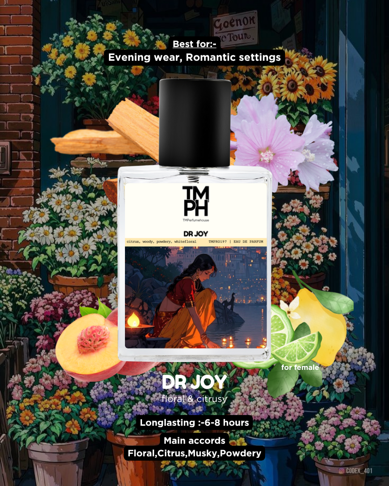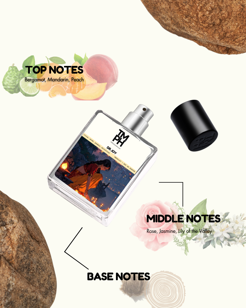 dr joy is a sparkling scent that celebrates light and happiness. It opens with vibrant bergamot and mandarin, leading into a heart of rose, jasmine, and peach for floral brightness. The base of sandalwood, cedar, and musk adds warmth and softness, creating a fragrance that feels joyful, modern, and irresistibly feminine.