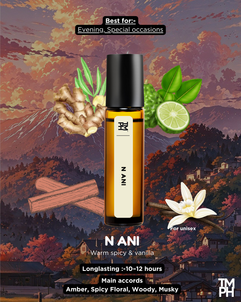 N Ani AT (inspired by Nish**e A'ni) is a rich, hypnotic, and ultra-sensual vanilla fragrance with an addictive warmth that feels luxurious and unforgettable. It opens with a striking burst of fresh bergamot and crisp green notes wrapped in spicy ginger and cardamom, creating a bright yet fiery entrance. As it develops, the heart reveals a creamy wave of smooth vanilla blended with soft florals and subtle spices, building a warm, romantic, and deeply comforting aura. In the dry-down, amber, benzoin, sandalwood, and musk melt together with the vanilla to form a velvety, long-lasting base that feels both cozy and seductive — the kind of sweetness that stays close to the skin but lingers for hours.