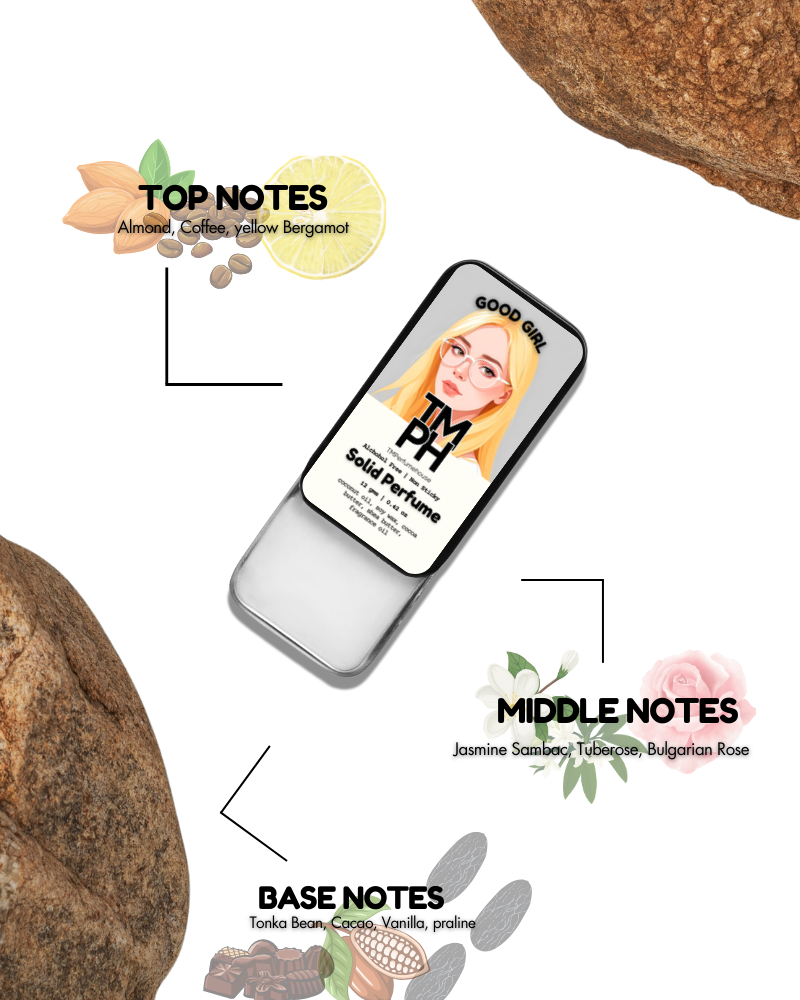 GOOOD GIIRL Solid Perfume – Step into your power with a scent that’s playful, daring, and unmistakably glamorous. It opens with sweet, bright notes that instantly captivate, blends into a heart of rich florals, and settles into a deep, sensual base of cocoa, tonka, and warm woods.