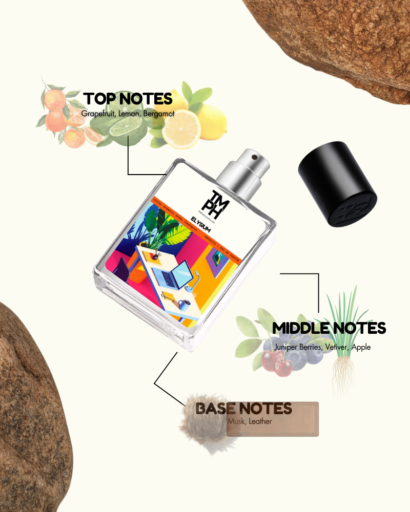 Elysium opens with a burst of grapefruit, lemon, and blackcurrant, blended with herbs and florals. The base of leather and woods adds richness. Bright yet complex, it celebrates masculine elegance and energy, creating a timeless scent of confidence and luxury.