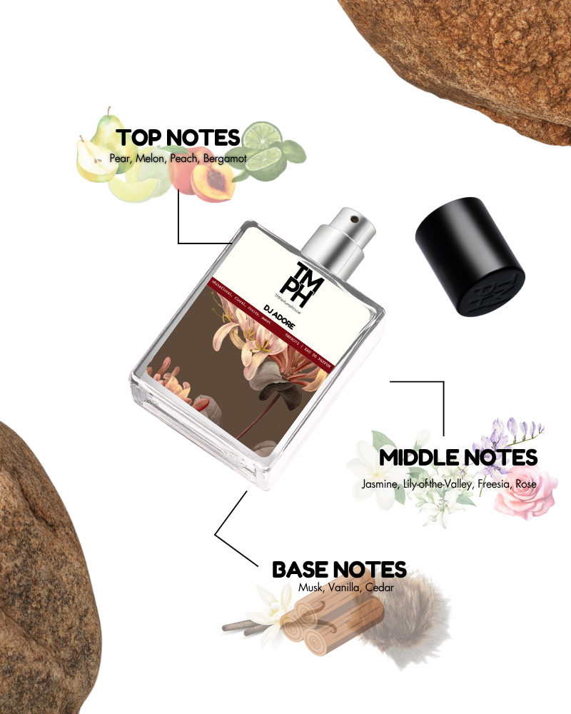 DJ Adore blends fresh mandarin and bergamot with a floral heart of jasmine, rose, and ylang-ylang. Soft notes of musk and vanilla create sensual depth. Feminine, radiant, and refined, it’s a fragrance that celebrates modern glamour and timeless beauty with an aura of charm and sophistication.