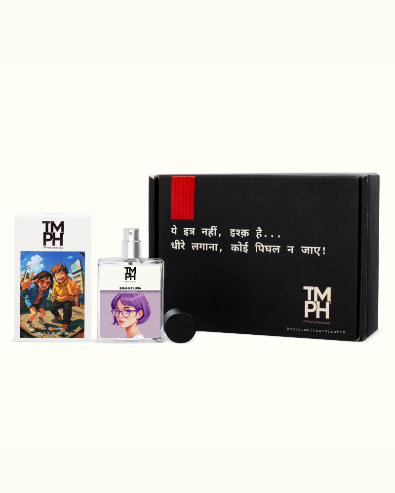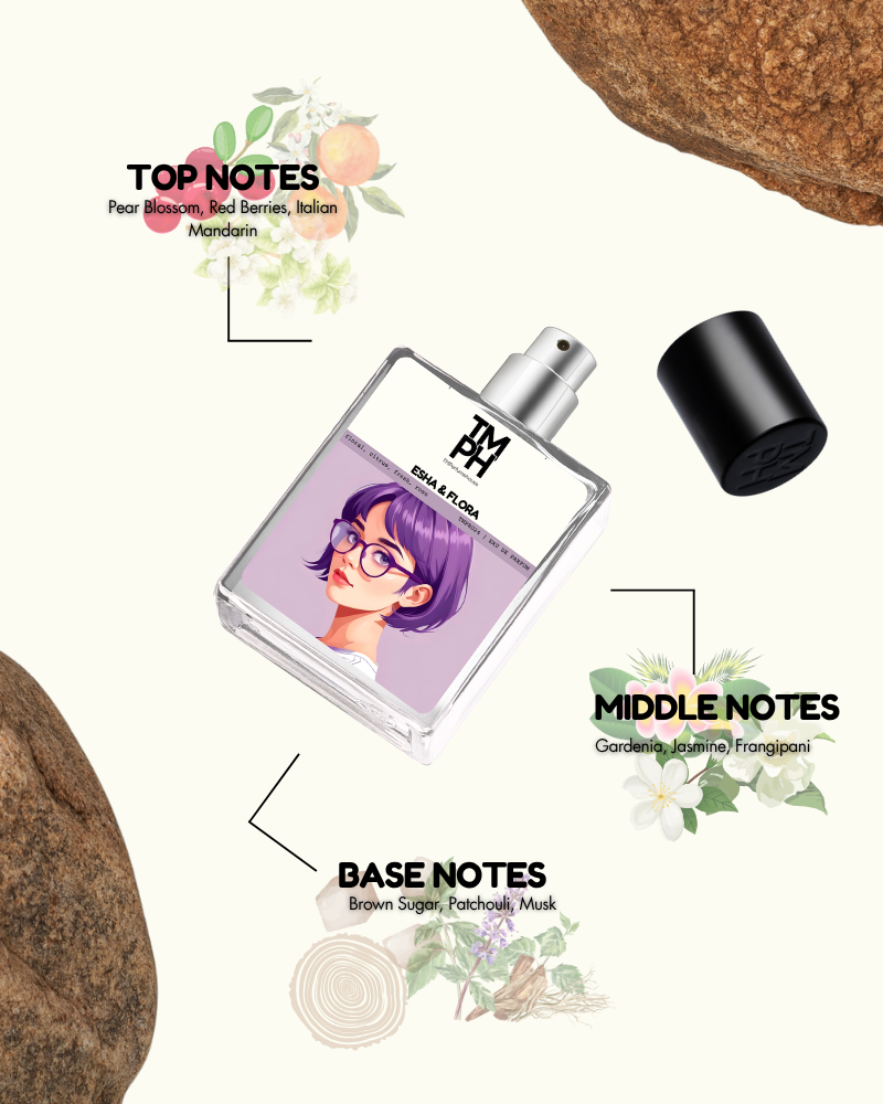 Esha & Flora bursts with the brightness of citrus, softened by delicate peony, rose, and osmanthus petals. Wrapped in warm sandalwood and patchouli, it strikes the perfect balance between playful freshness and graceful sophistication. The fragrance feels luminous and romantic, leaving a lasting impression of effortless beauty and timeless charm.