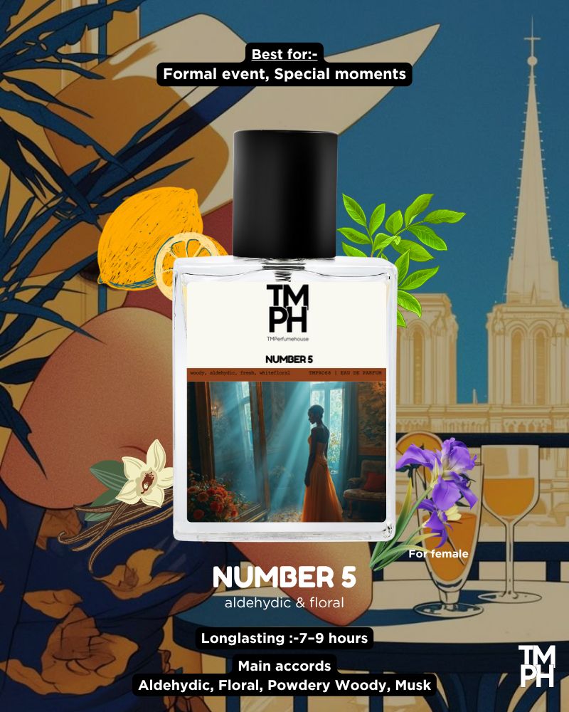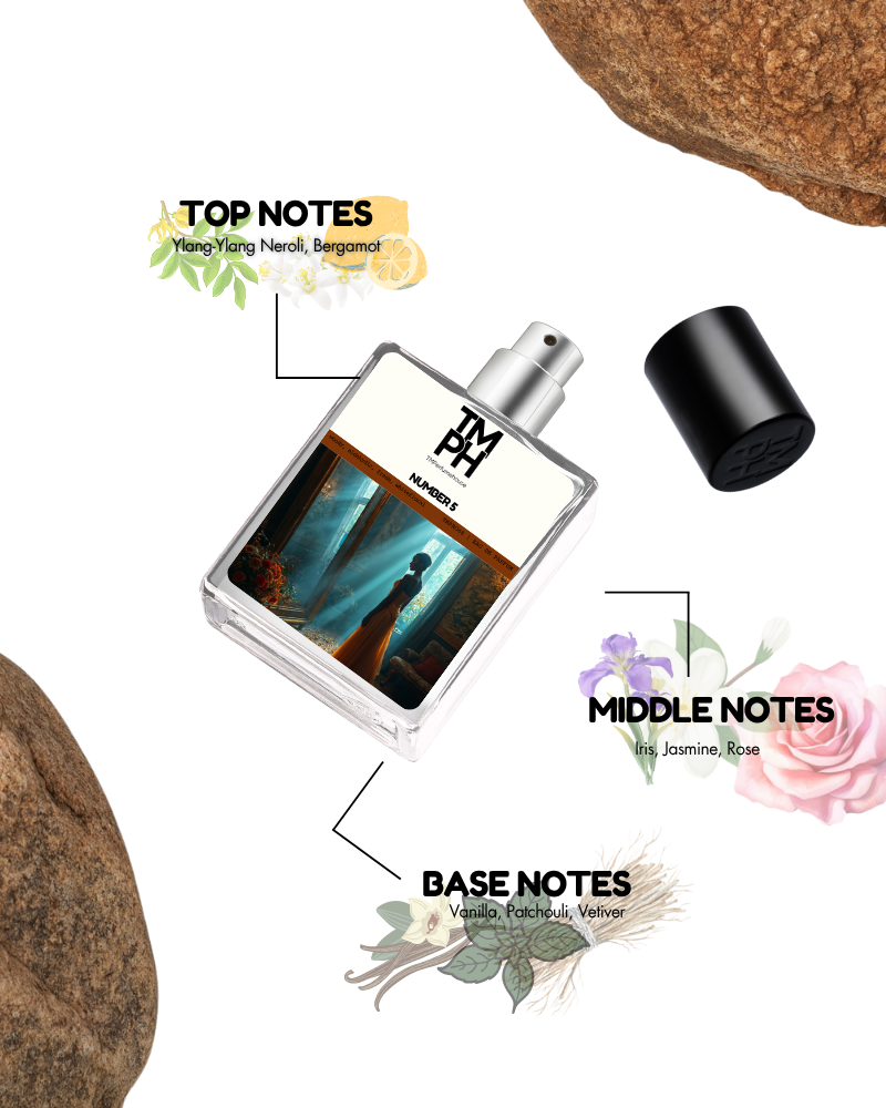Number 5 opens with sparkling aldehydes and citrus, flowing into a rich bouquet of jasmine, rose, and ylang-ylang. Settling into warm sandalwood, vanilla, and musk, it creates an elegant, velvety aura. Classic and sophisticated, Number 5 embodies eternal grace, leaving a trail of refinement, allure, and unmatched feminine elegance.