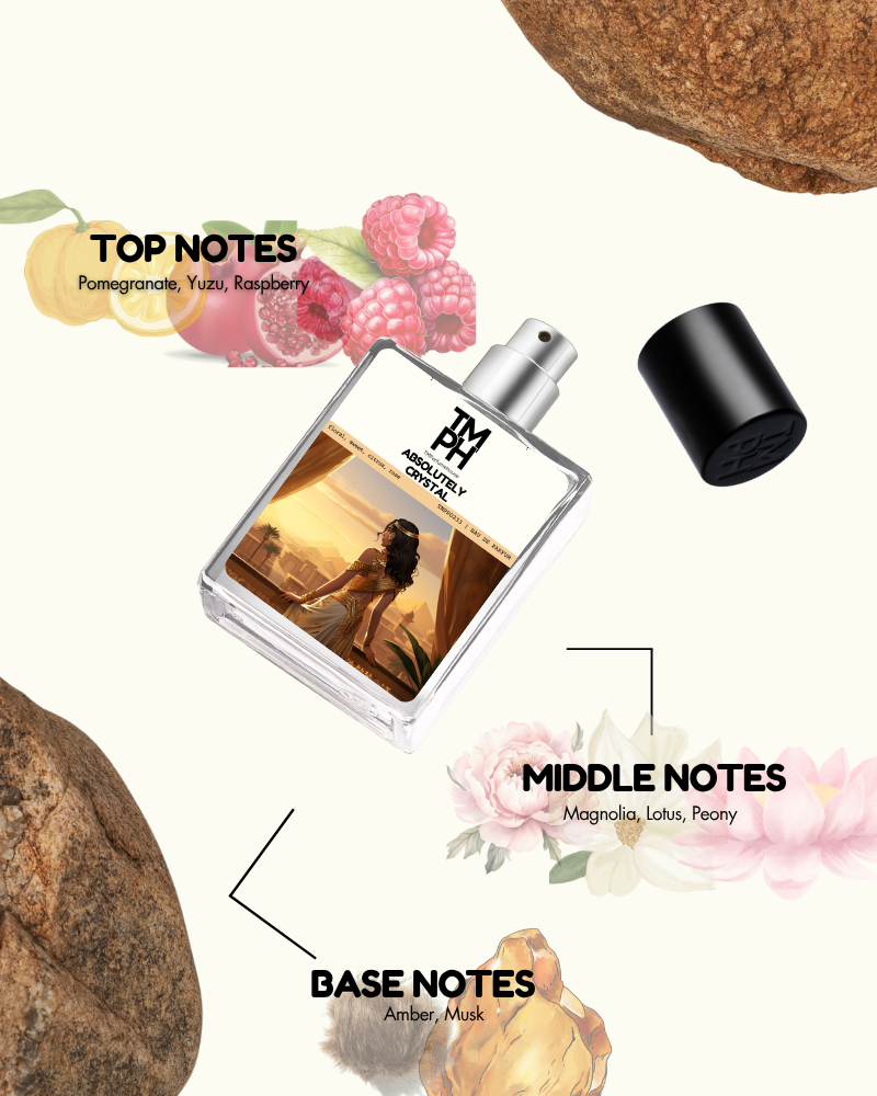 absolutely crystal is a luminous scent full of vibrancy and charm. It opens with juicy pomegranate and iced accord, leading into a heart of peony, magnolia, and lotus for floral delicacy. The base of amber, musk, and mahogany provides warmth, creating a fragrance that feels youthful, modern, and irresistibly feminine.